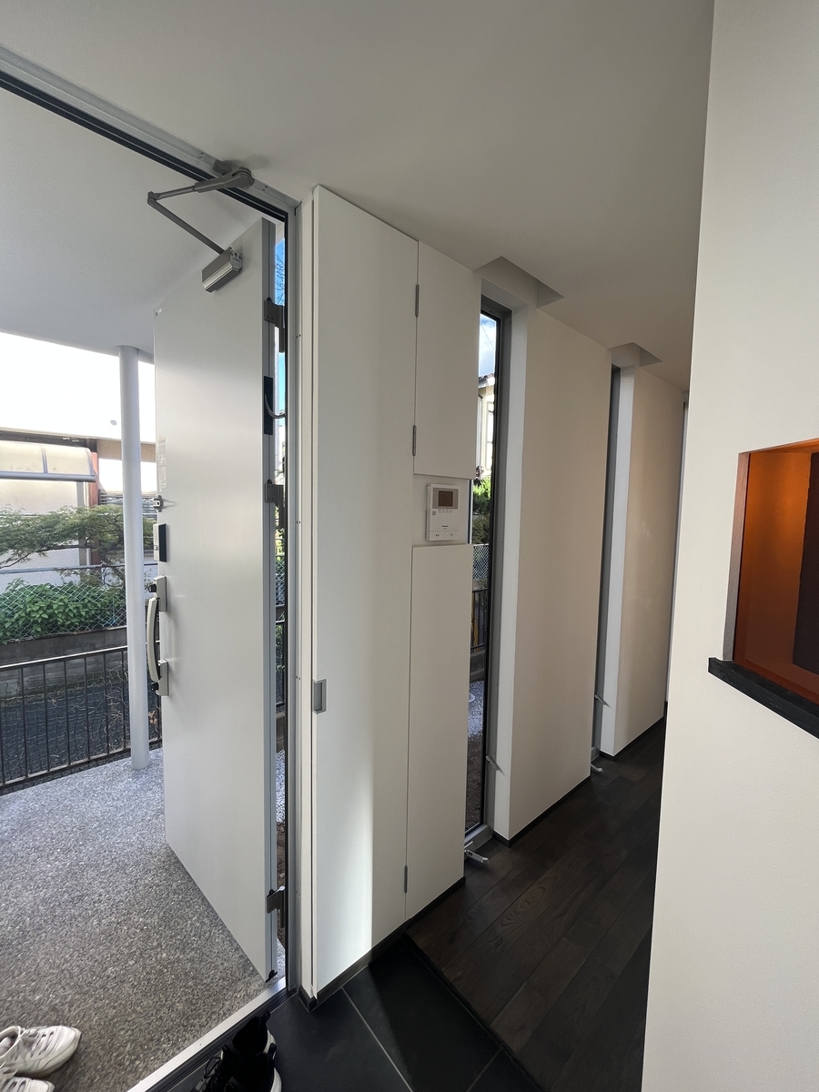 ガレージの引戸と格子塀、そして玄関へ入る引戸
