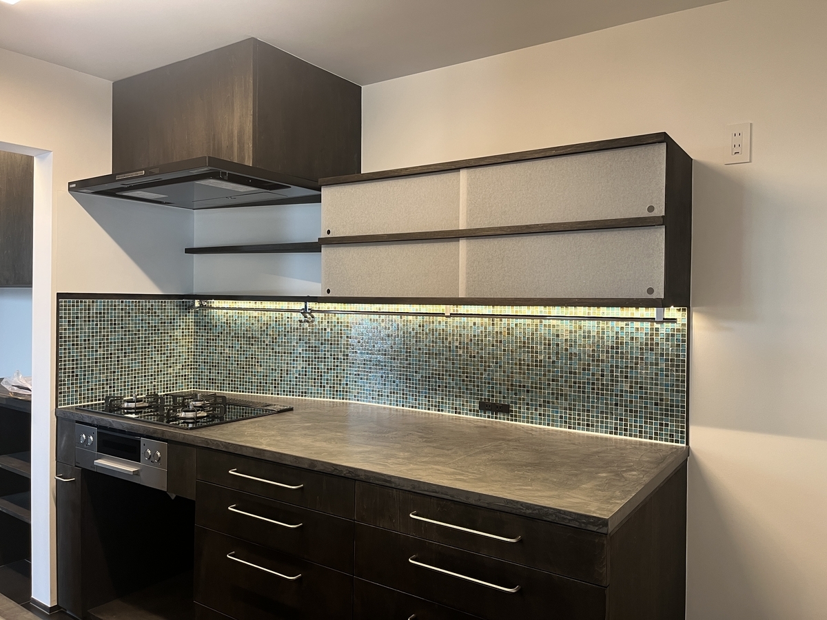 キッチンは少し雰囲気を変えて、ブラックを基調としたインテリアに。