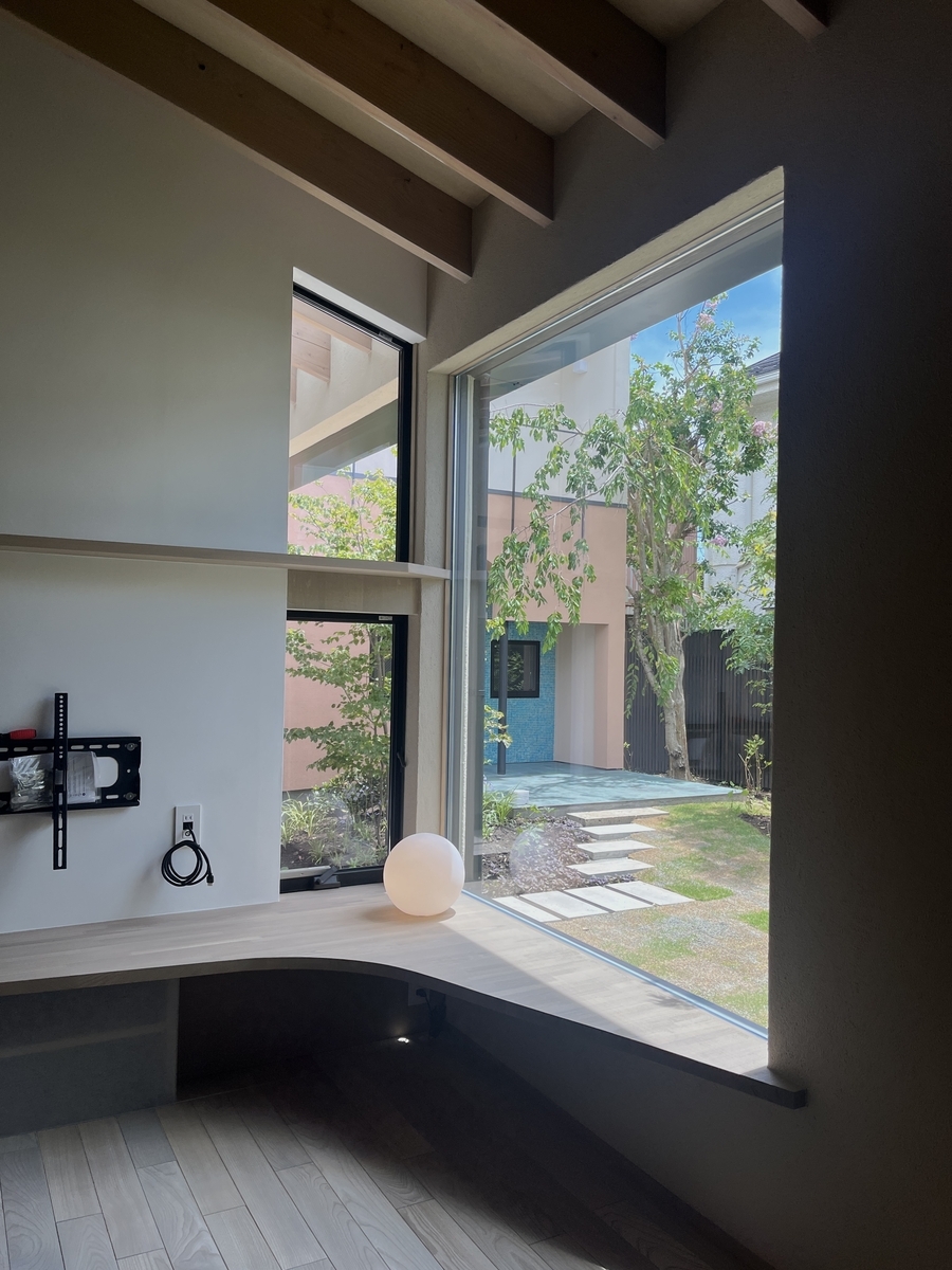 こちらのフレームレスなガラスも出窓と同様、スチールで造ったオリジナル窓です。